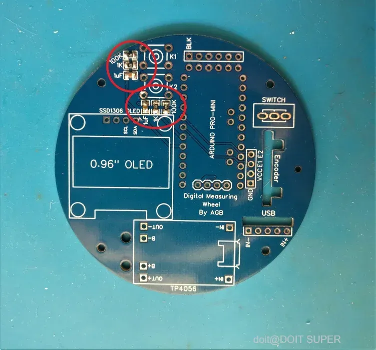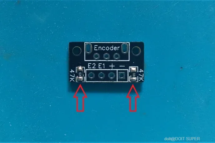 取出编码器分线板 PCB,并焊接两个 47K 电阻,如图所示。这些电阻用于限制流向编码器的电流。