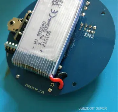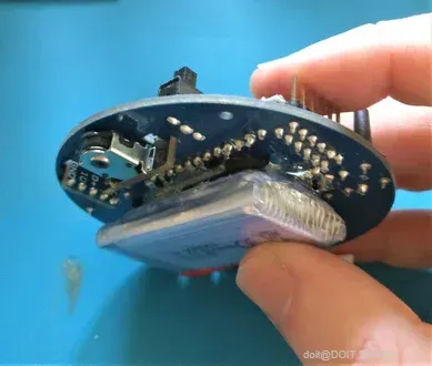 将 DMW 的 PCB 翻转过来,并用热胶将 LiPo 电池固定在 PCB 的中心位置。您可能需要在电池下方添加一块纸板,以保护电池免受 Arduino 针脚的损坏。确保电池的引线朝向电路板的 TP-4056 端。