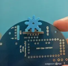 现在我们将编码器 PCB 连接到主 DMW PCB。为此,首先将编码器 PCB 插入 DMW PCB 上标有编码器的插槽。编码器的杆应穿过 DMW PCB 上的相应孔,如图所示。编码器的齿轮侧应位于 DMW PCB 的底部。