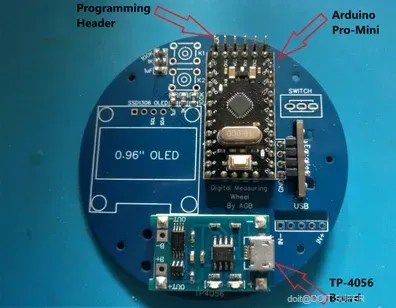 然后,如图所示,将 Arduino Pro-Mini、其编程头和 TP-4056 板焊接到位。