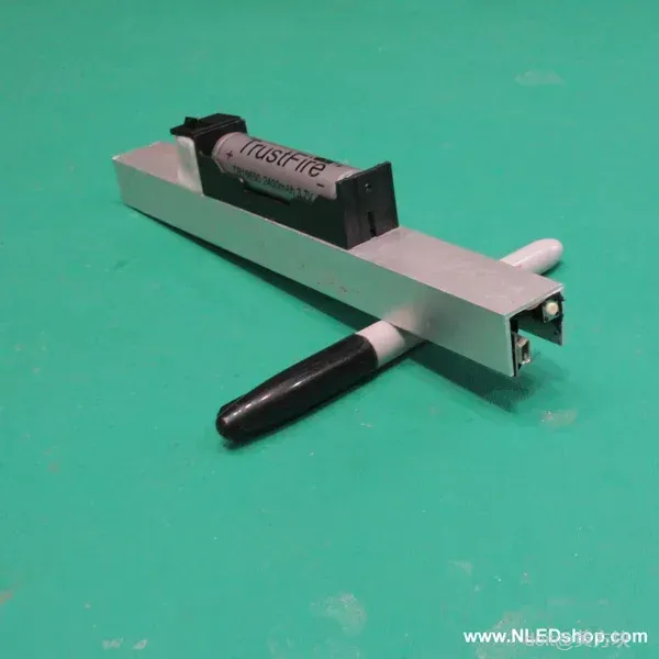 - 测量、切割、焊接,并用热缩管套住电池座和开关线,然后将它们穿过挤压件上的孔。小心,孔可能有锋利的边缘,去除毛刺或进行绝缘处理。