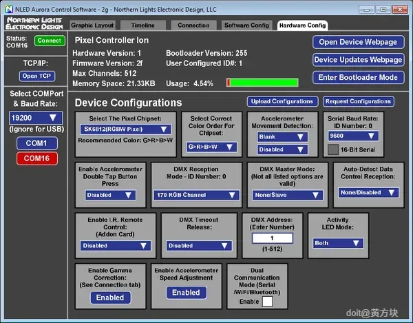 2. 控制器名称及相关信息将自动填充至“硬件配置”标签页。请根据您的控制器、像素灯及其他设置调整配置模块。必须设置像素芯片类型(Pixel Chipset)及颜色顺序(Color Order):WS2812等默认为GRB;SK6812则需设为GRBW。