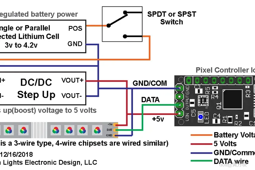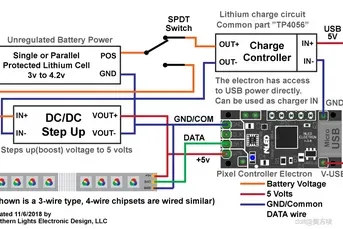 选择直接用 18650 电池为像素灯供电,无需升压至 5 伏。SK6812 和几乎所有其他 5 伏芯片组都能在单节锂电池的较低电压下正常工作。单节锂电池的电压范围在 4.2 伏到 3 伏之间。一旦电池放电至 3.3 伏以下,蓝色 LED 就会停止工作。这实际上会减少电池的可用电量,但对于这个标识中的 12 个像素灯来说,仍然有足够的运行时间。电池可以取出充电。