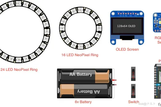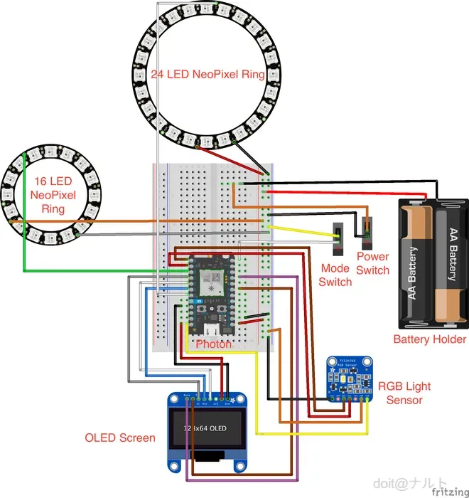 根据电路在代码中初始化两个LED NeoPixel环、OLED屏幕、RGB光传感器和模式开关: