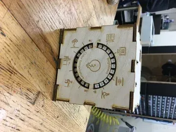 工作模式:正面通过一个LED NeoPixel环展示两种照明信息(光照强度和色温)。当顶面的模式开关切换至“工作”时,光传感器开始测量当前照明环境的光照强度和色温。LED NeoPixel环会根据实时的光照强度和色温亮起。环的上半部分附近设有四个工作任务图标,分别代表阅读、常规办公、常规绘图工作和精细工作,对应不同的光照强度。环的下半部分附近设有三个工作氛围图标,分别代表舒适、明亮和活力,对应不同的色温范围。