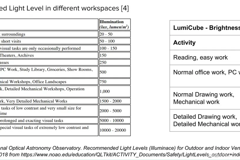 根据美国国家光学天文台(NOAO)提供的《室内外场所推荐光照水平(照度)》指南,针对不同工作任务设置了四种光照强度: